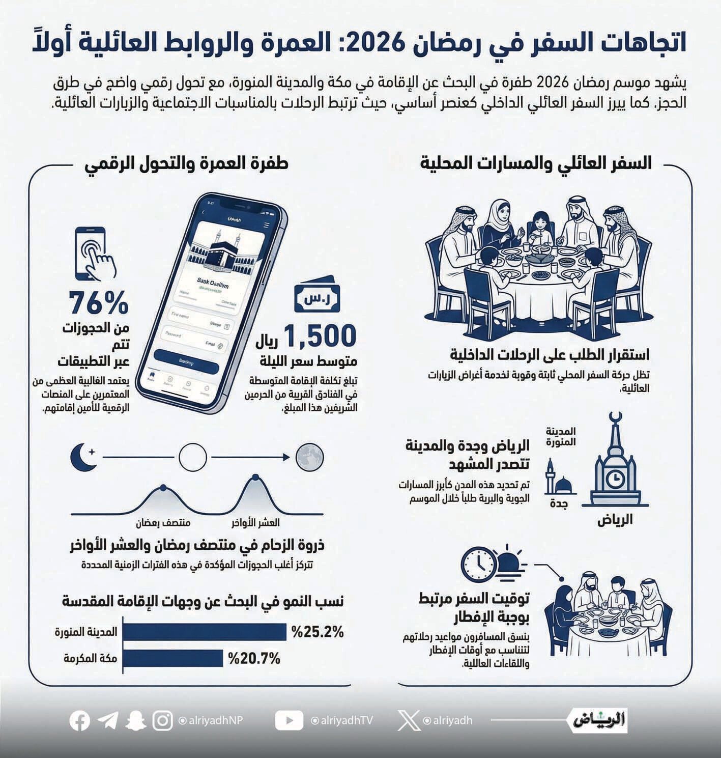 كشفت بيانات سفر حديثة عن ارتفاع ملحوظ في وتيرة سفر المقيمين داخل المملكة العربية السعودية خلال شهر رمضان 2026، مدفوعًا باستمرار الطلب القوي على رحلات العمرة والتنقلات العائلية، وقد سجلت عمليات البحث عن أماكن الإقامة في مكة المكرمة نموًا بنسبة 20.67 %، فيما ارتفعت في المدينة المنورة بنسبة 25.16 % مقارنة بالفترة ذاتها من عام 2025، مع بلوغ الطلب ذروته خلال النصف الثاني من الشهر الفضيل.