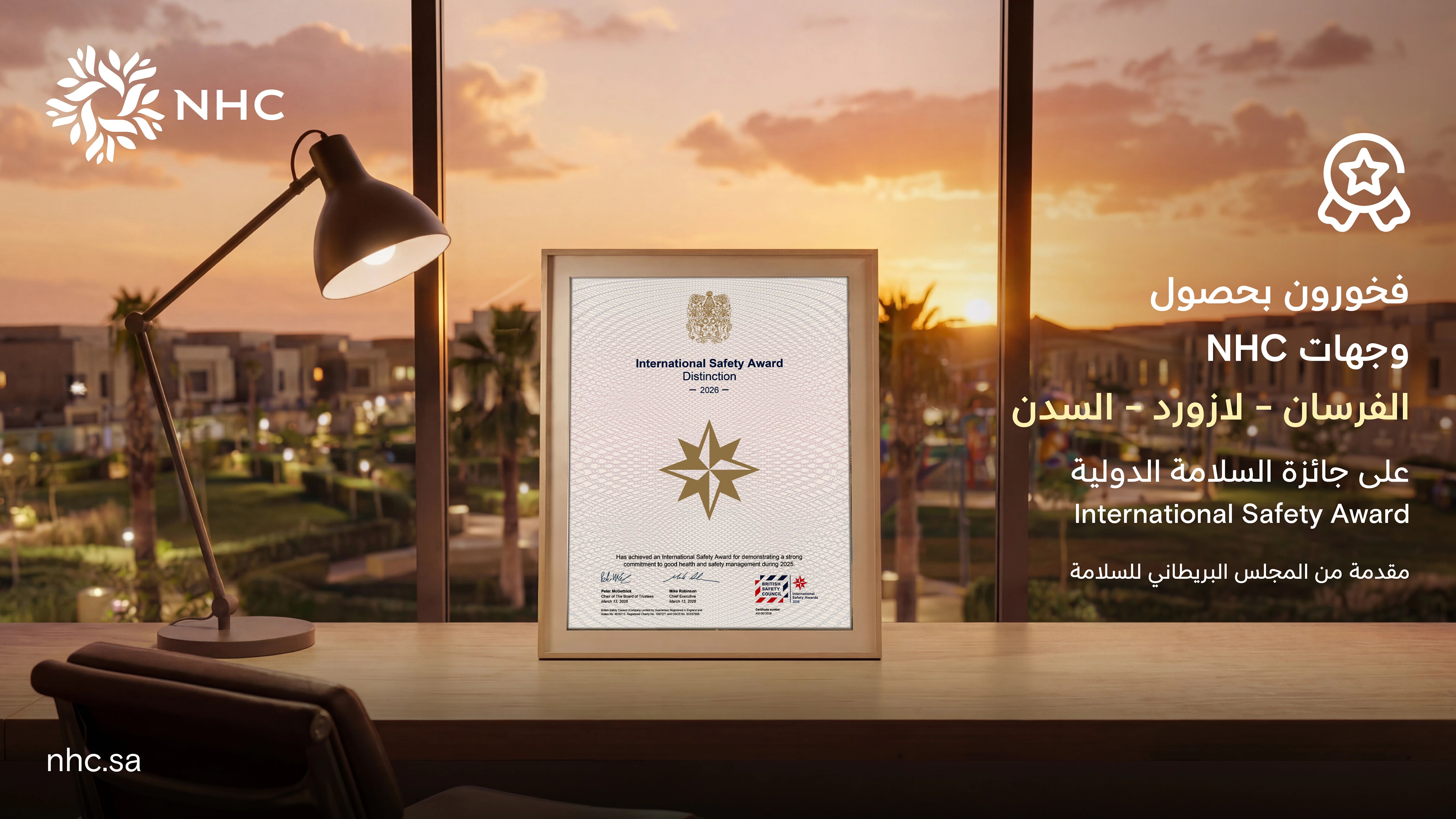 حققت NHC إنجازًا جديدًا بحصولها على 3 جوائز ضمن مستوى التميّز في جائزة السلامة الدولية 2026 المقدّمة من المجلس البريطاني للسلامة، وذلك عن ثلاثة مشاريع نموذجية في وجهة الفرسان بالرياض، ووجهة السدن