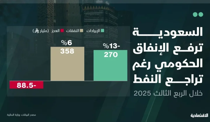 رفعت الحكومة السعودية إنفاقها خلال الربع الثالث من العام الجاري 6%، ليبلغ 358 مليار ريال للصرف على المشاريع والبرامج الإجتماعية، فيما تراجعت الإيرادات 13% إلى 270 مليار ريال مع تراجع دخل النفط نتيجة نزول الأسعار، ما نتج عنه عجزا قيمته 88.5 مليار ريال.