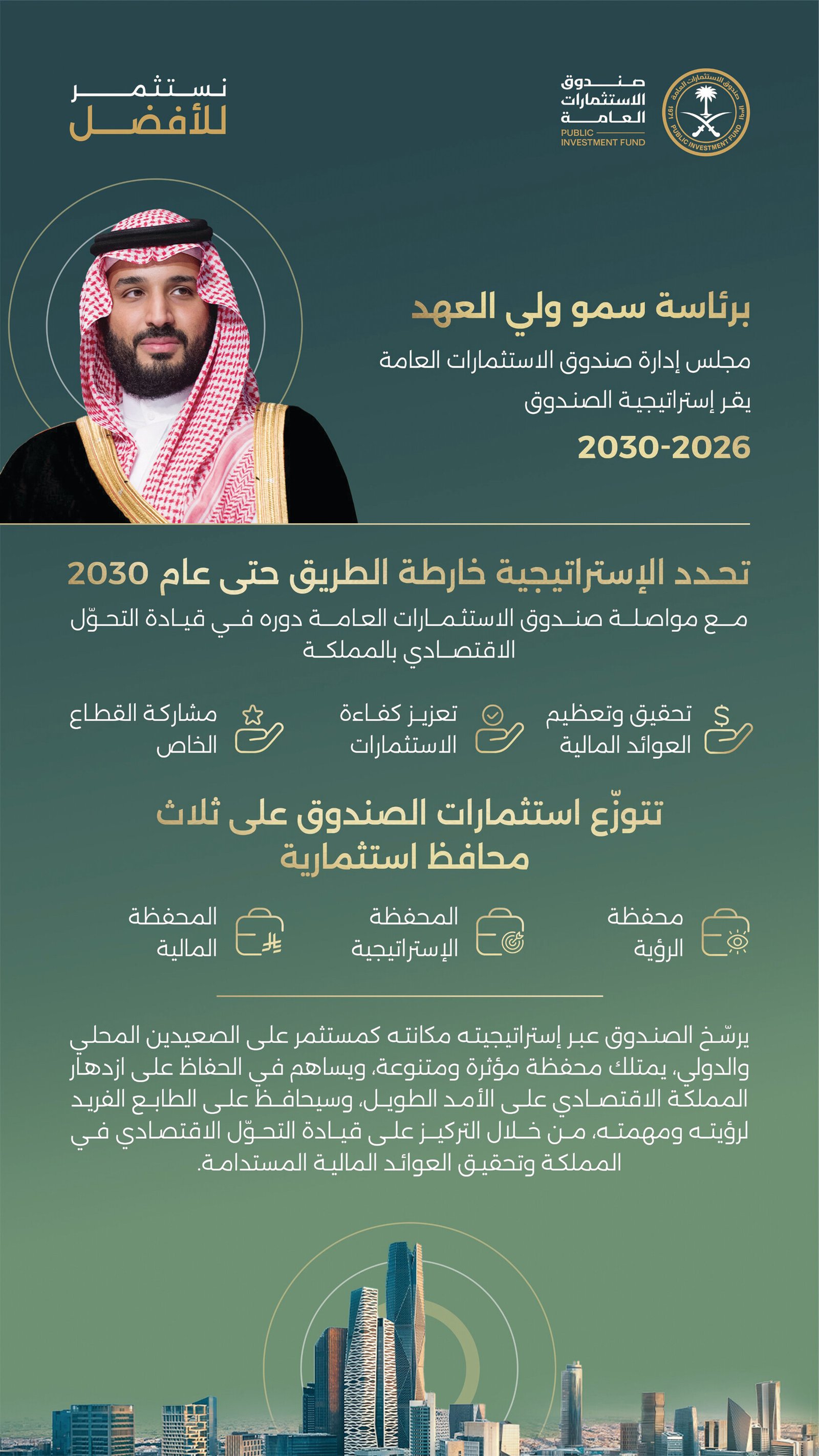 في الوقت الذي أقرّ فيه مجلس إدارة صندوق الاستثمارات العامة استراتيجية الصندوق 2026 - 2030، برئاسة صاحب السمو الملكي الأمير محمد بن سلمان بن عبدالعزيز آل سعود ولي العهد رئيس مجلس الوزراء رئيس مجلس إدارة صندوق الاستثمارات العامة -حفظه الله-، حيث سيركز الصندوق على بناء منظومات اقتصادية محلية بقدرة تنافسية عالية، بما يدعم التكامل بين القطاعات وتعظيم قيمة الأصول الاستراتيجية واستدامة العوائد، ومواصلة مسيرة التحوّل الاقتصادي في المملكة وتعزيز جودة حياة مواطنيها.