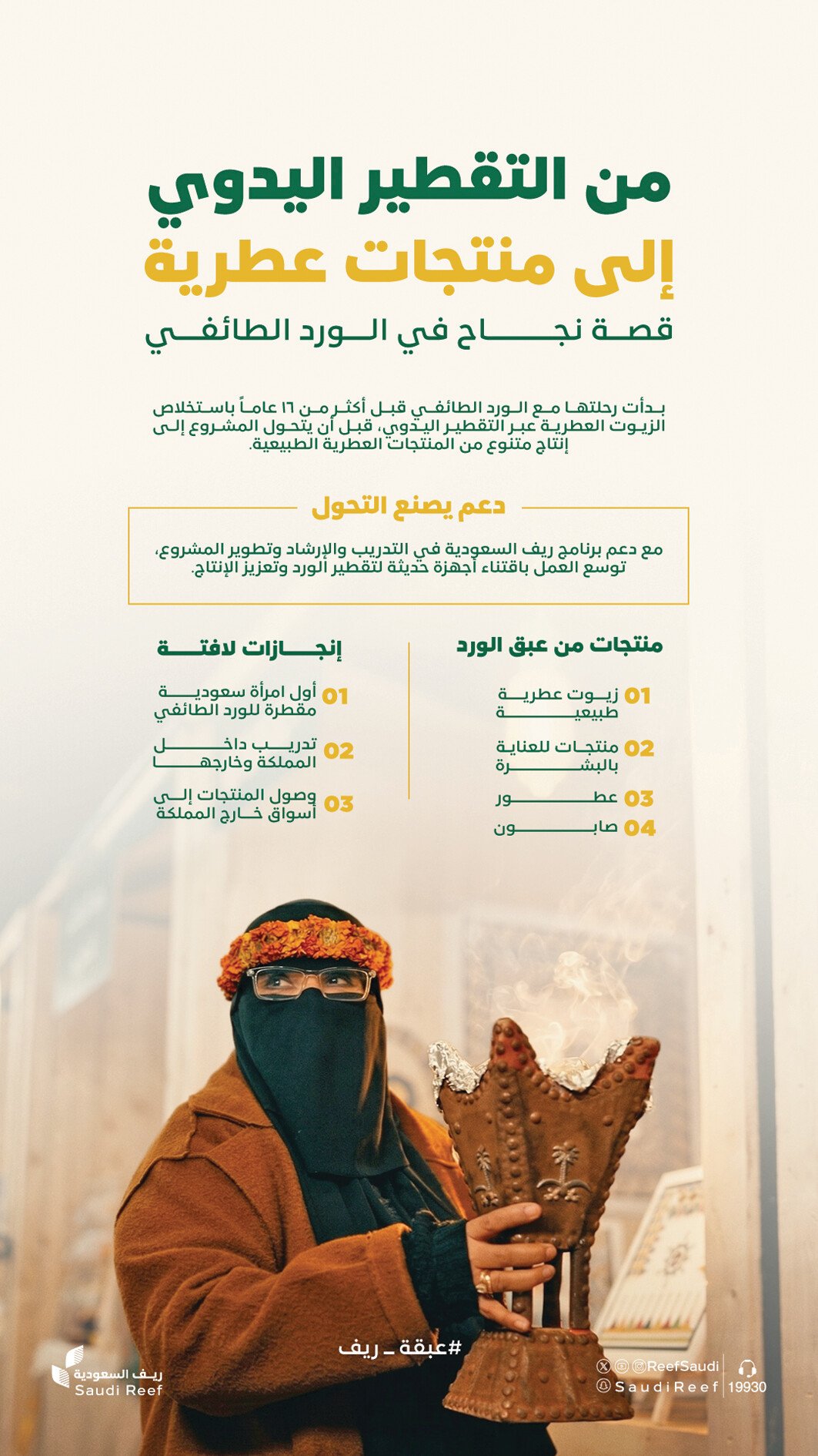جريدة الرياض بدأت علاقة السيدة السعودية حفيظة السوادي مع إنتاج الزيوت العطرية الطبيعية قبل 16 عامًا، وكانت تعتمد في إنتاجها في بداياتها على العمل اليدوي بالكامل، من قطف الورد الطائفي، ثم تقطيره واستخلاص الزيوت منه، وهي عملية تستنزف جهدًا كبيرًا، ولكن قادها شغفها وحبها لهذا العمل لإتقانه والتوسع فيه، حتى نجحت في صُنع علامة مميزة في عالم مستحضرات التجميل والزيوت العطرية الطبيعية عبر منتجاتٍ فاخرة.